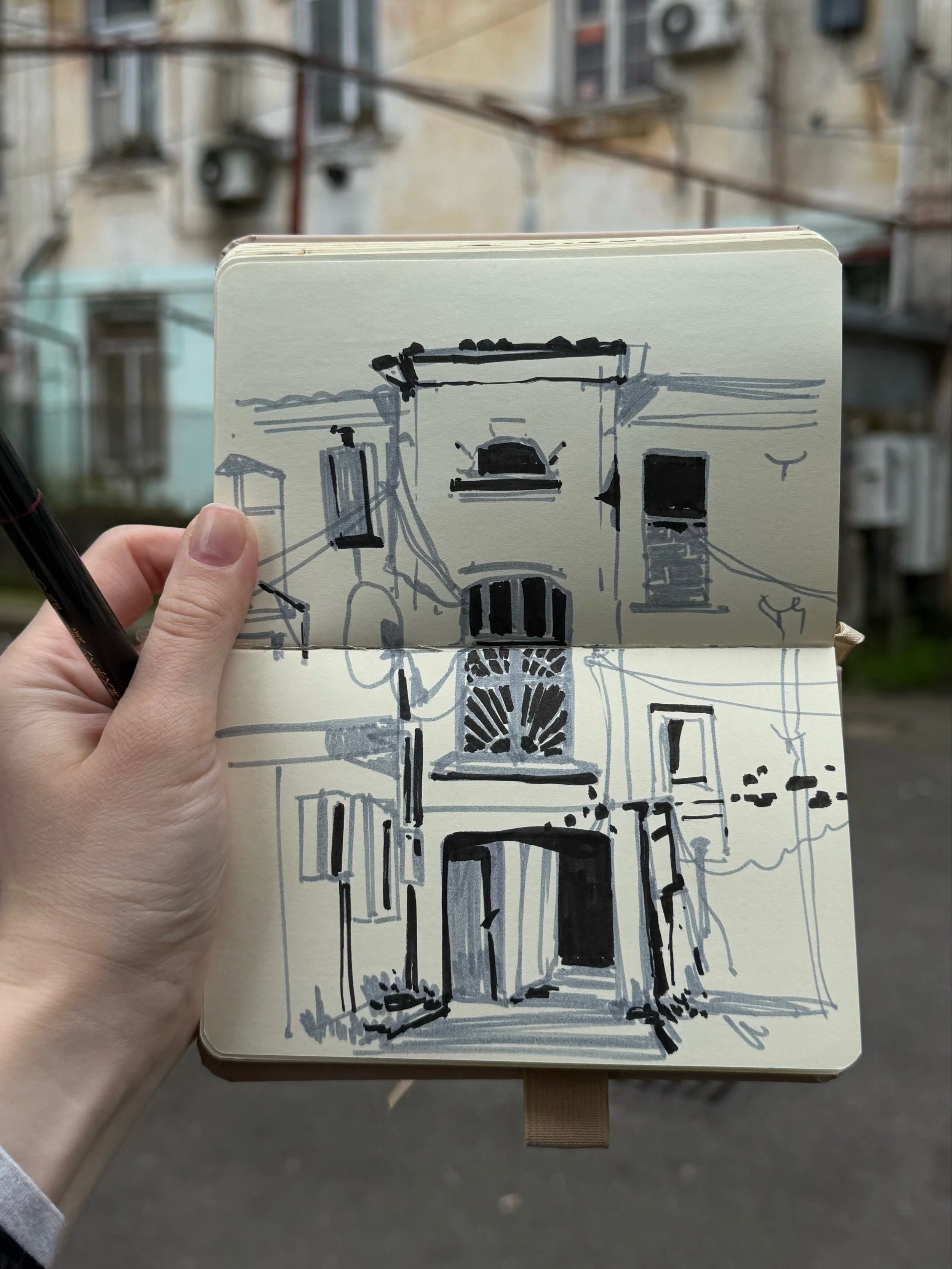 Ala Southiick draws what she sees, where she sees it. The Serbian illustrator and environmental artist works in plein-air: sketchbook open, pen moving, catching street life as it passes.