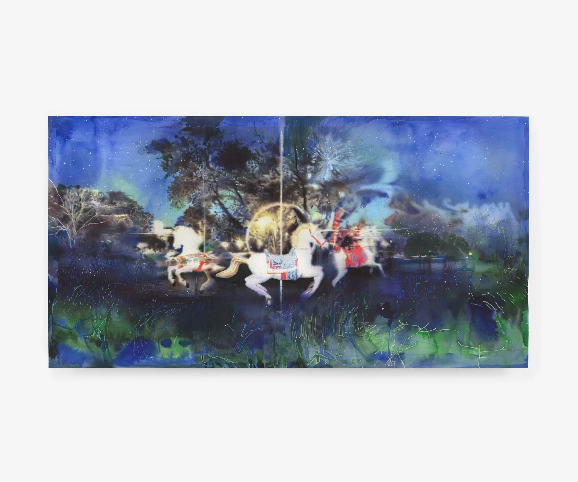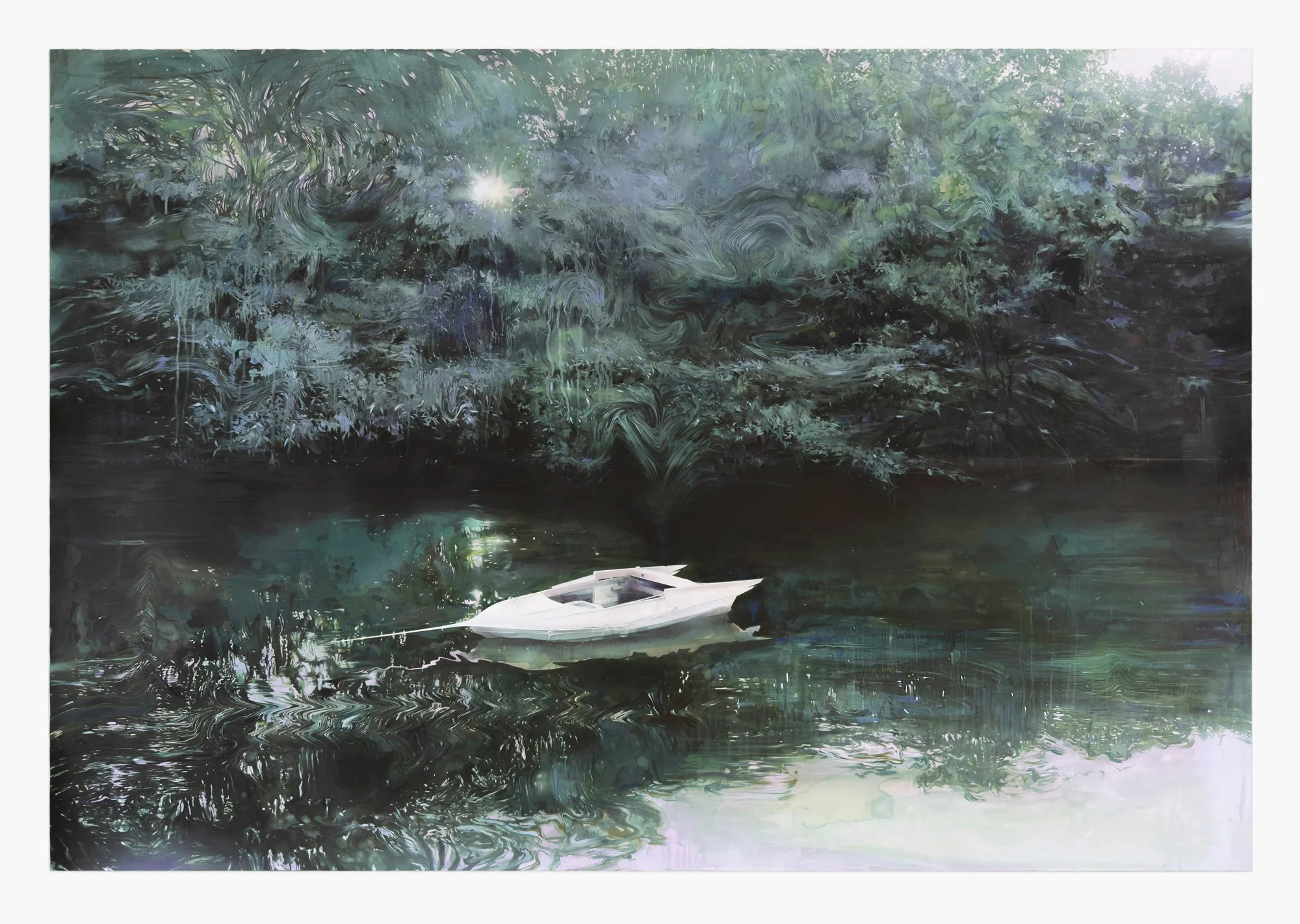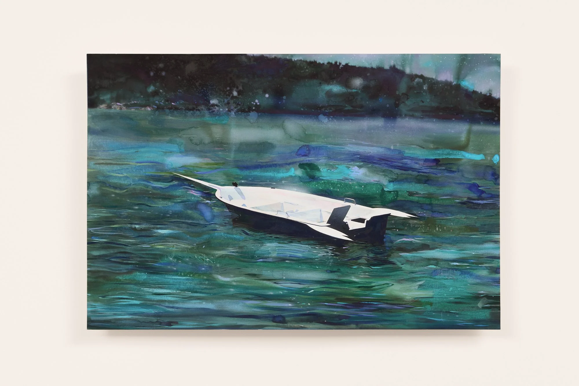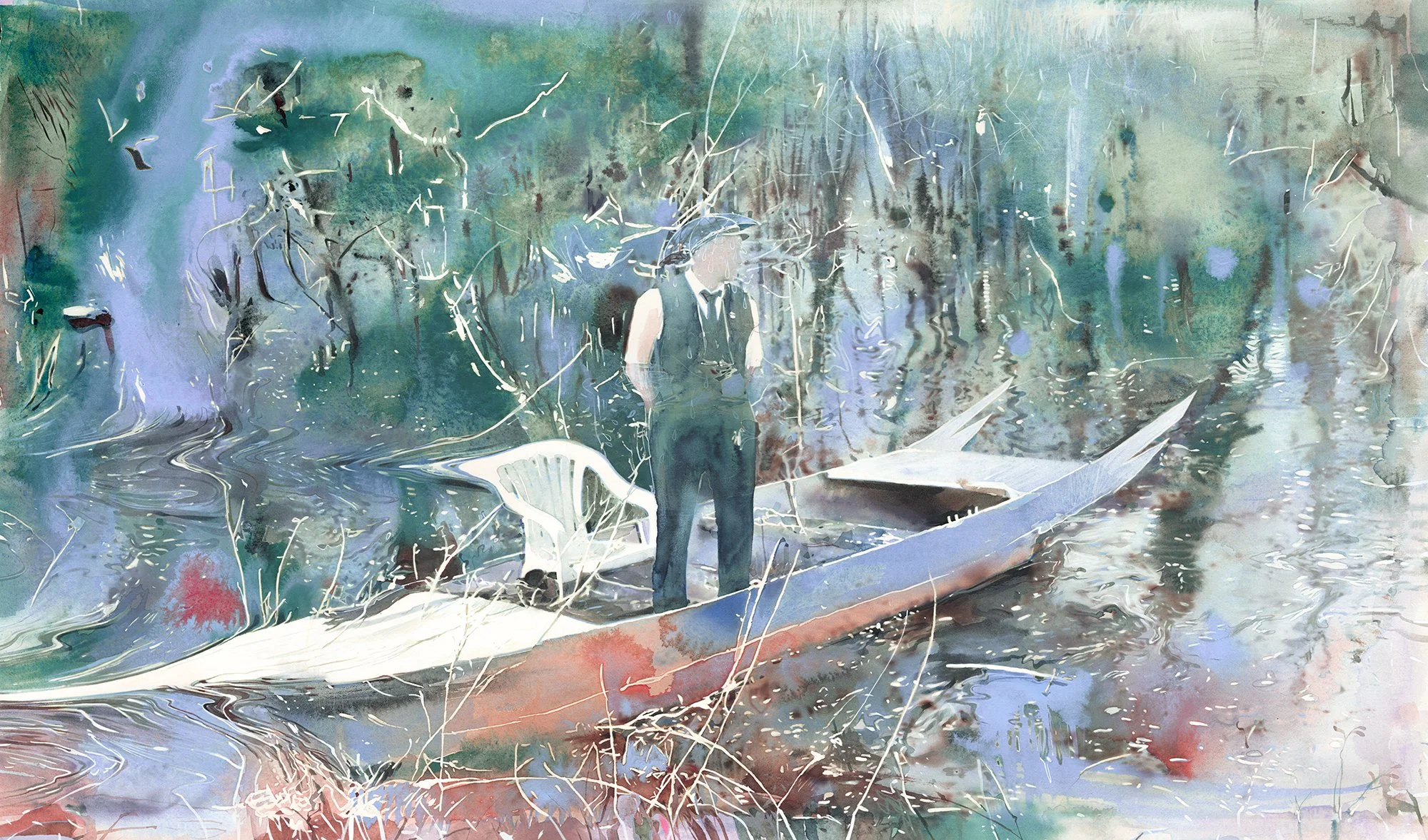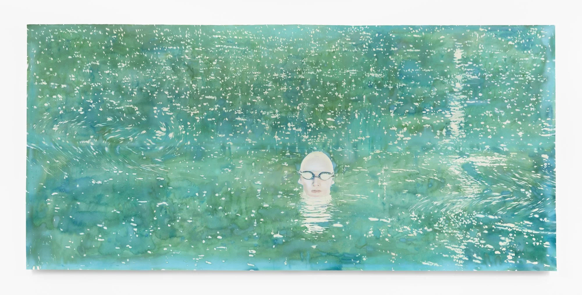 The process begins before he touches a brush. Contributors (or as Rebus calls them, “floaters”) across the globe collect water samples — from parks, alleyways, abandoned buildings — and mail them to his studio. Rebus freezes each sample with watercolour pigments, then lets it melt onto paper. The ice dictates the first layer: unpredictable blooms, mineral traces, the ghost of a place he's never been. Others arrive carrying contamination, political residue, ecological unrest — water as document as much as material.